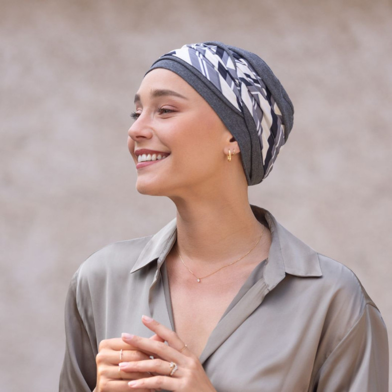 Pris en charge. Turbans, bonnets, franges, couronnes de cheveux. Matières respirantes et adaptées aux cuirs chevelus fragilisés.